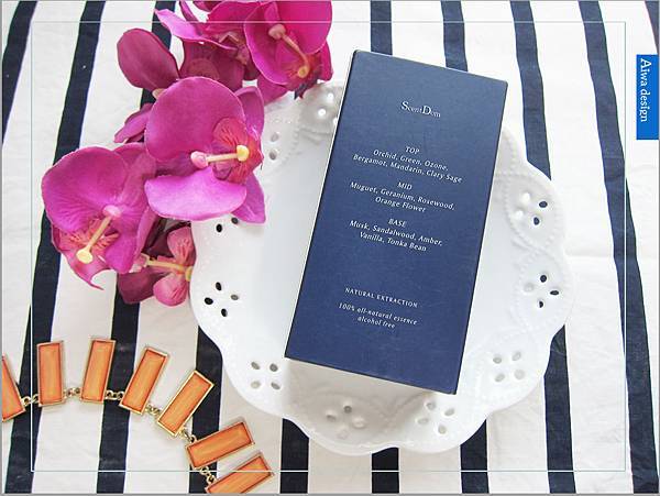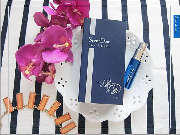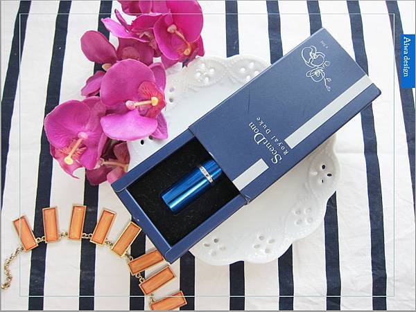 深藍的外盒,印著優雅的蘭花圖騰,而蝴蝶蘭花語是幸福來臨之意,給自己幸福,也給他人幸福。瓶身是俐落的金屬質感,香詩典ScentDom給人的第一印象是理性的,展現一股低調的美感。